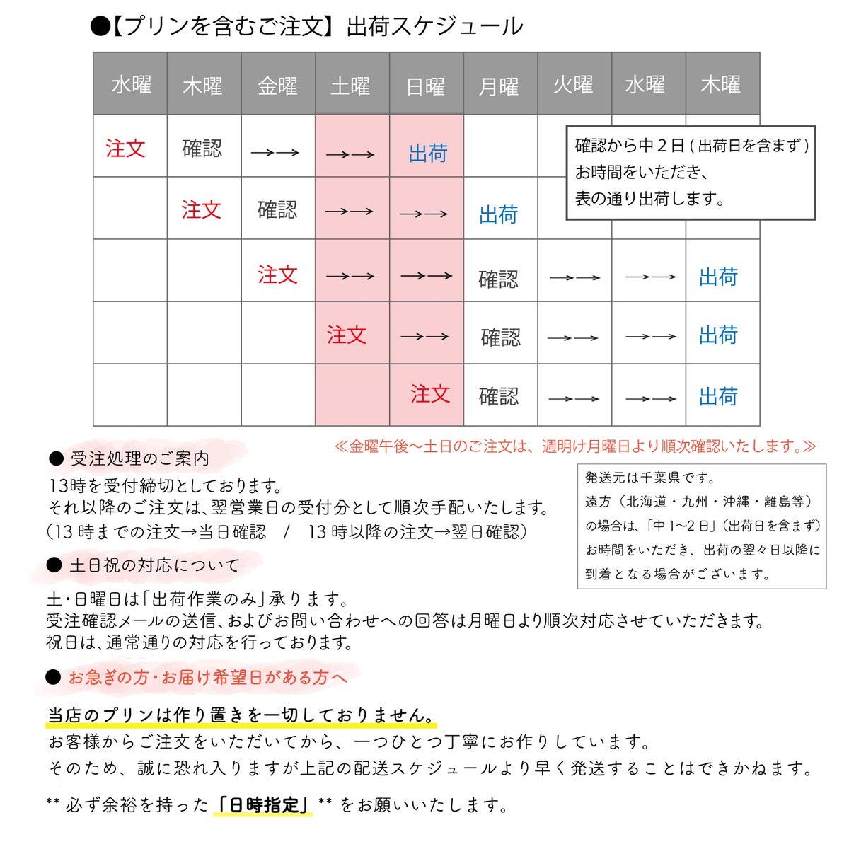 製造から14日です。(※さくらプリンのみ10日です)ご注文を頂いてから手作りし、3営業日以内に発送します(13時までのご注文で当日受付とさせて頂いております)。